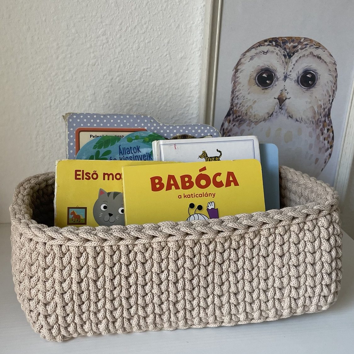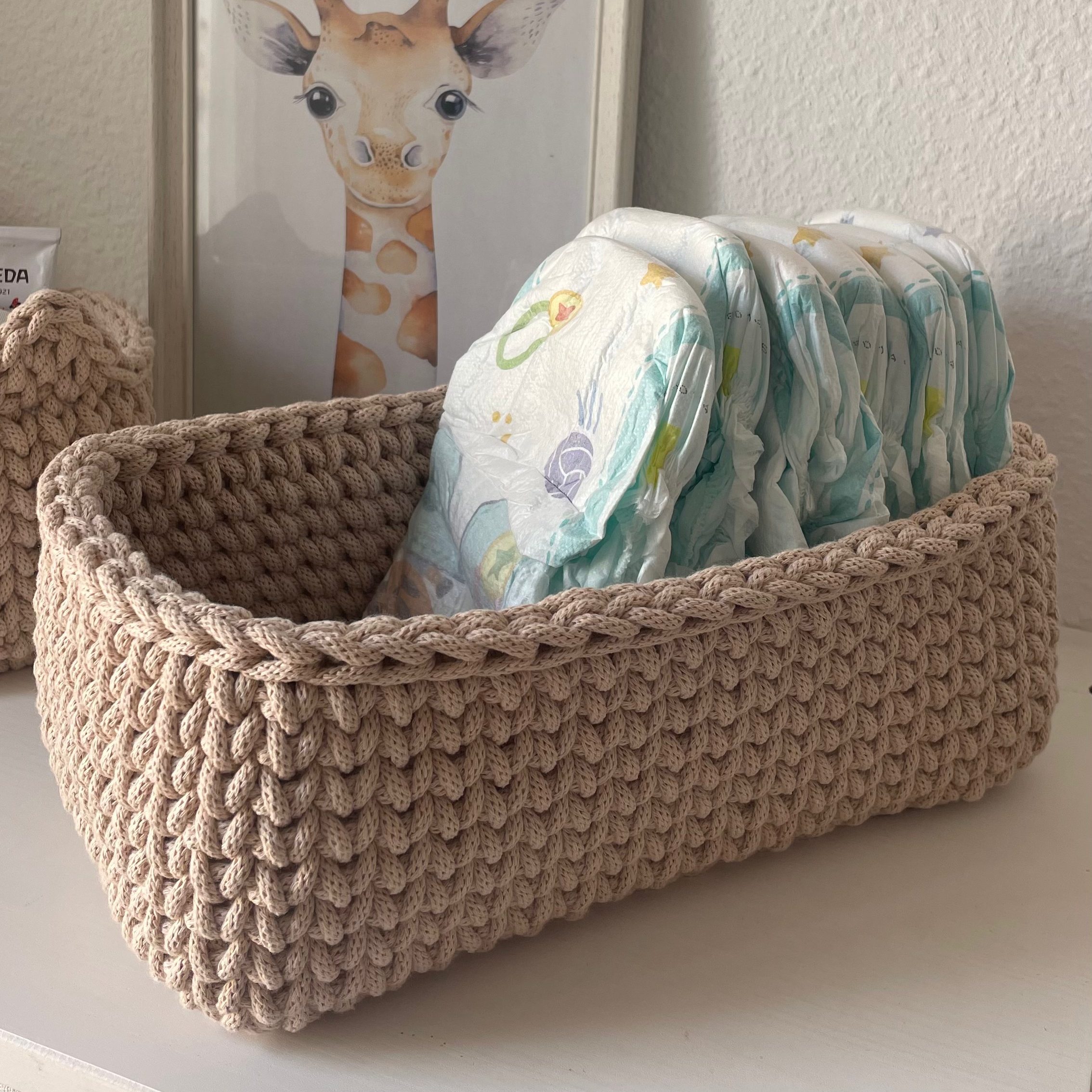 Su tamaño es perfecto para guardar pañales, toallitas, cremas o pequeños accesorios de cuidado diario. Gracias a su diseño artesanal y delicado, no solo es útil, sino también un detalle decorativo que aporta calidez al espacio infantil.